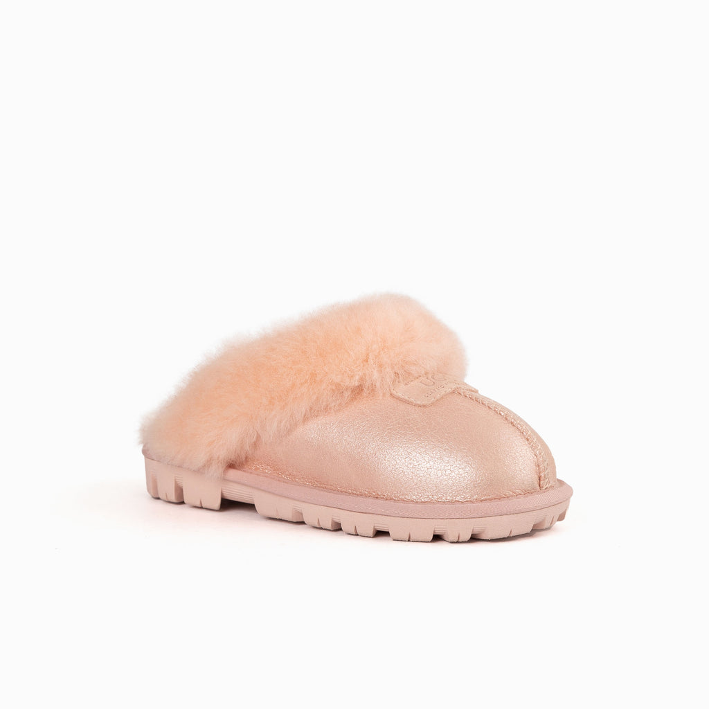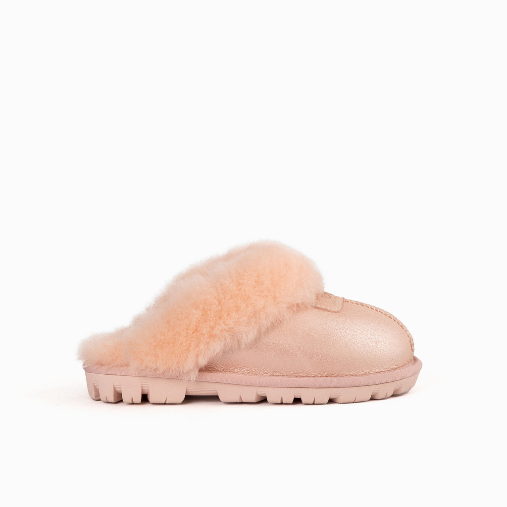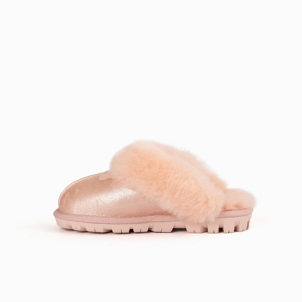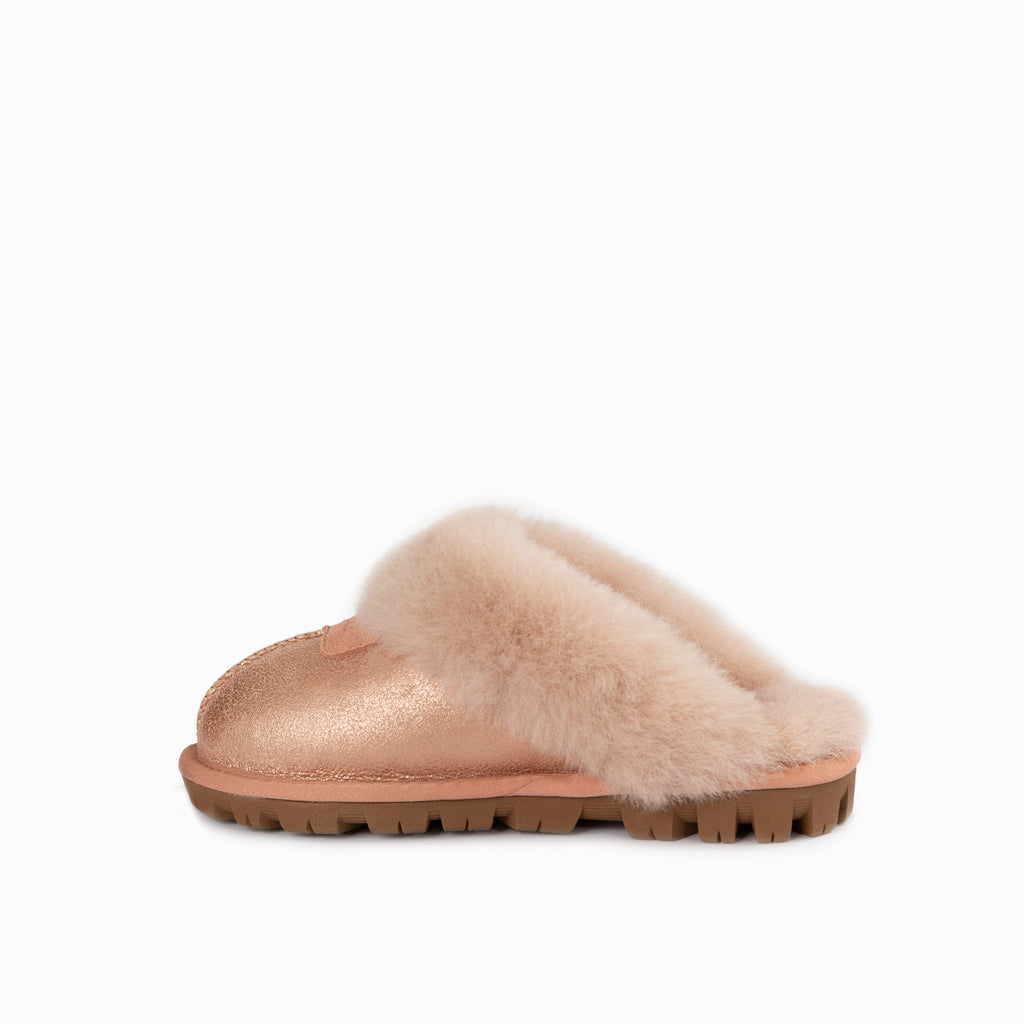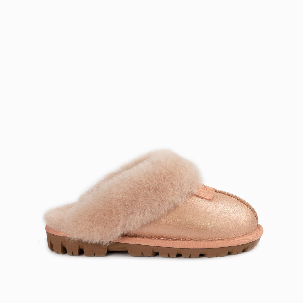 Beautiful sheepskin slipper featuring a metallic finsih, open back, logo detail, sheepswool lining and sturdy rubber soles. The Coquette slipper is perfect for keeping your feet cosy and warm!